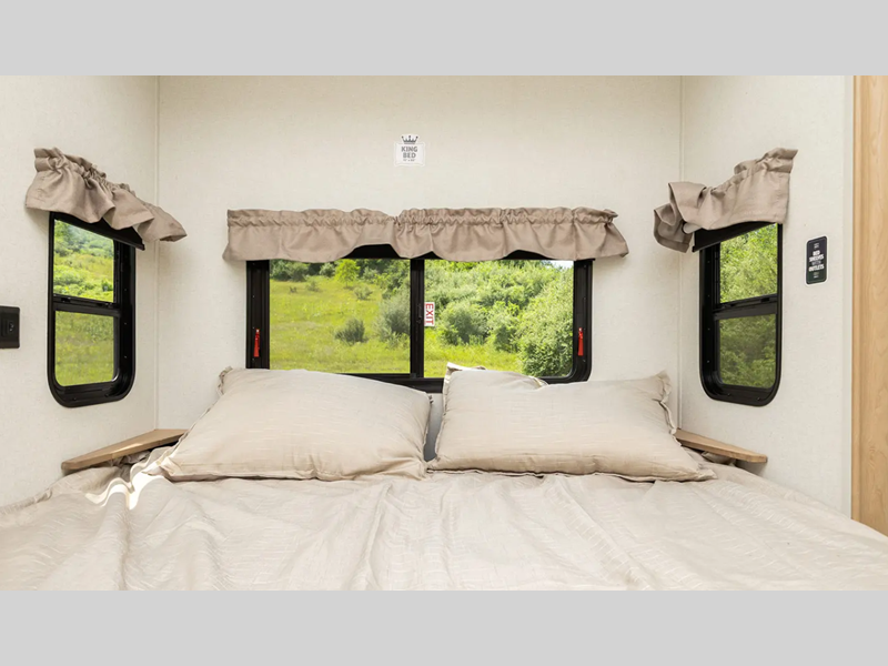 Each destination trailer features a painted full profile fiberglass front cap with a windshield, an underbelly armor, and Lippert auto adjust brakes for a smooth towing experience. Inside, you will love the solid surface kitchen countertops, residential stain resistant carpet, decorative backsplash, and many more comforts.
