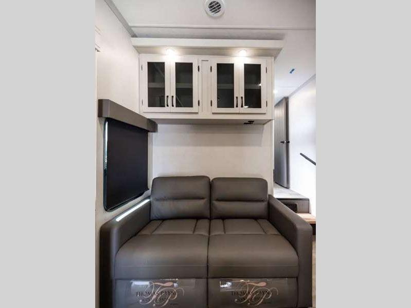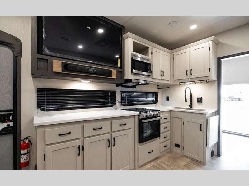 Sleeps 4 Slides 2 Interior Color Shimmer, Slate Available Beds Queen Refrigerator Type GE Stainless 12V Refrigerator Size 10 cu ft Cooktop Burners 3 Shower Size 34" x 34" Number of Awnings 1 Water Heater Type On Demand AC BTU 13500 btu TV Info LR 50" 4K Smart LED TV Awning Info 20' Electric w/LED Light Strip & One Hand Pitch Adjustment Axle Count 2 Shower Type Radius Electrical Service 50 amp Similar Floorplans